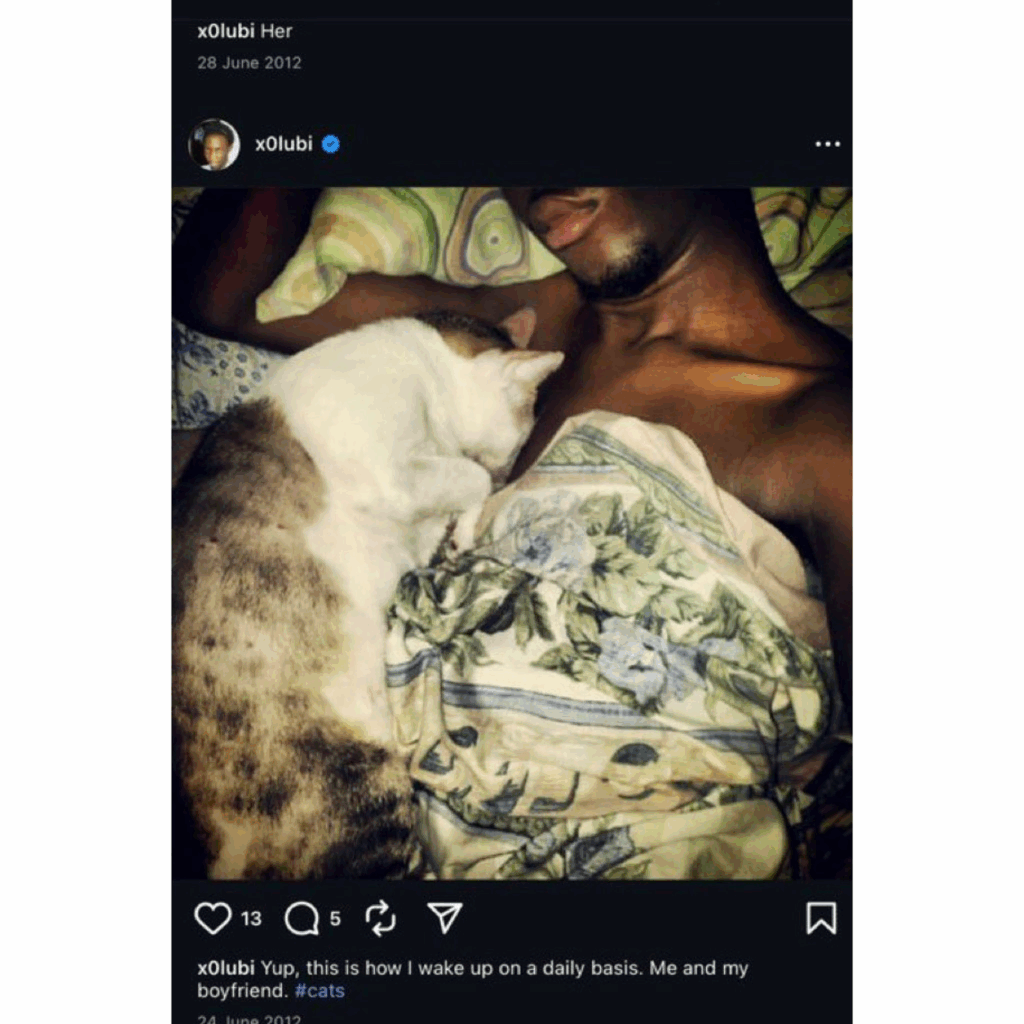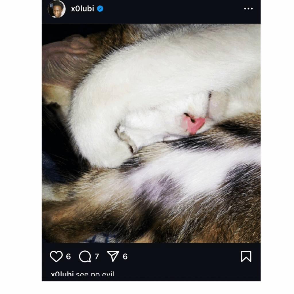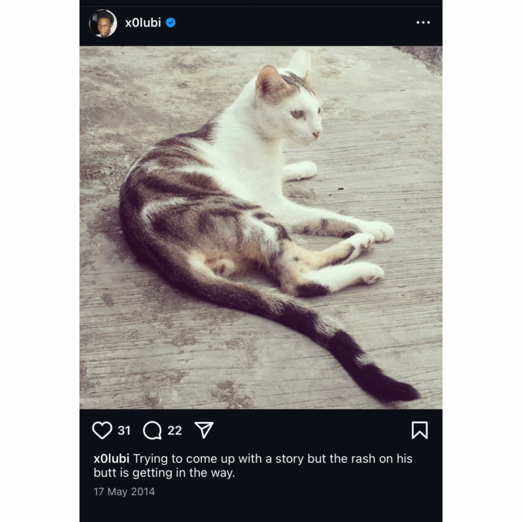 The posts, shared from an account believed to be Olubi’s, feature several images of cats paired with captions that have drawn criticism from social media users for being unsettling and inappropriate. One shows a cat lying on the floor with a caption referencing a rash “on his butt,” while another captures a cat mid-meow with the words, “My favourite. Right in the middle of a meow.”