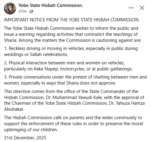 The Yobe State Hisbah Commission has announced a new directive prohibiting physical interaction and private conversations between men and women in commercial tricycles, motorcycles, and public gatherings across the state.