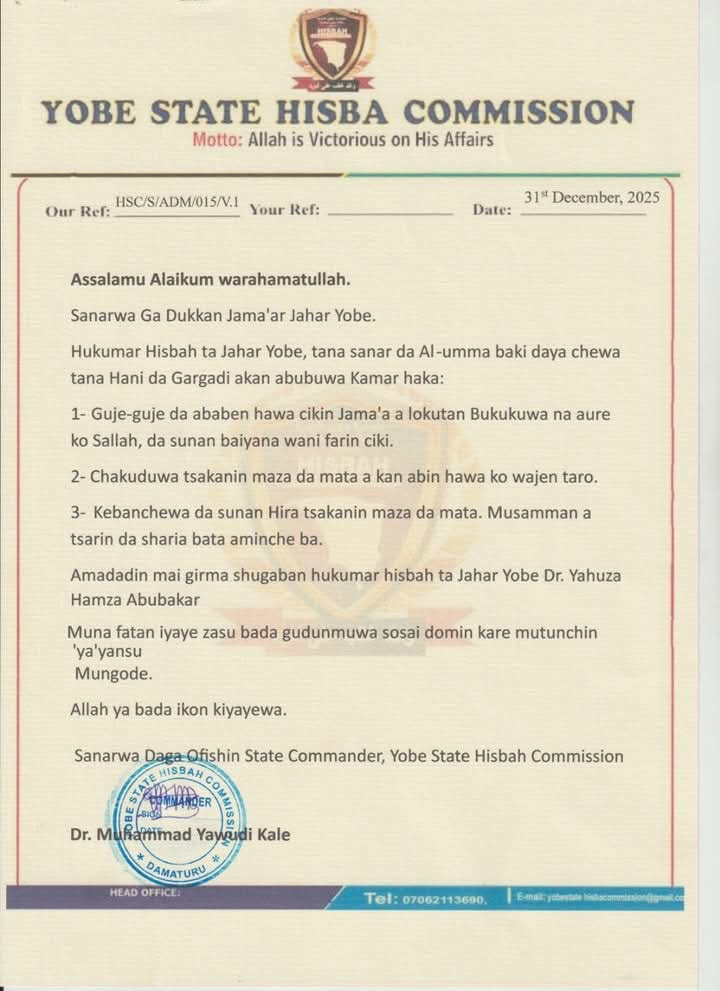 According to the statement, the order was issued by the State Commander of the Hisbah Commission, Dr. Muhammad Yawudi Kale, with the approval of the Commission’s Chairman, Dr. Yahuza Hamza Abubakar. The Commission said the measures are intended to enforce conduct consistent with the teachings of Sharia law.